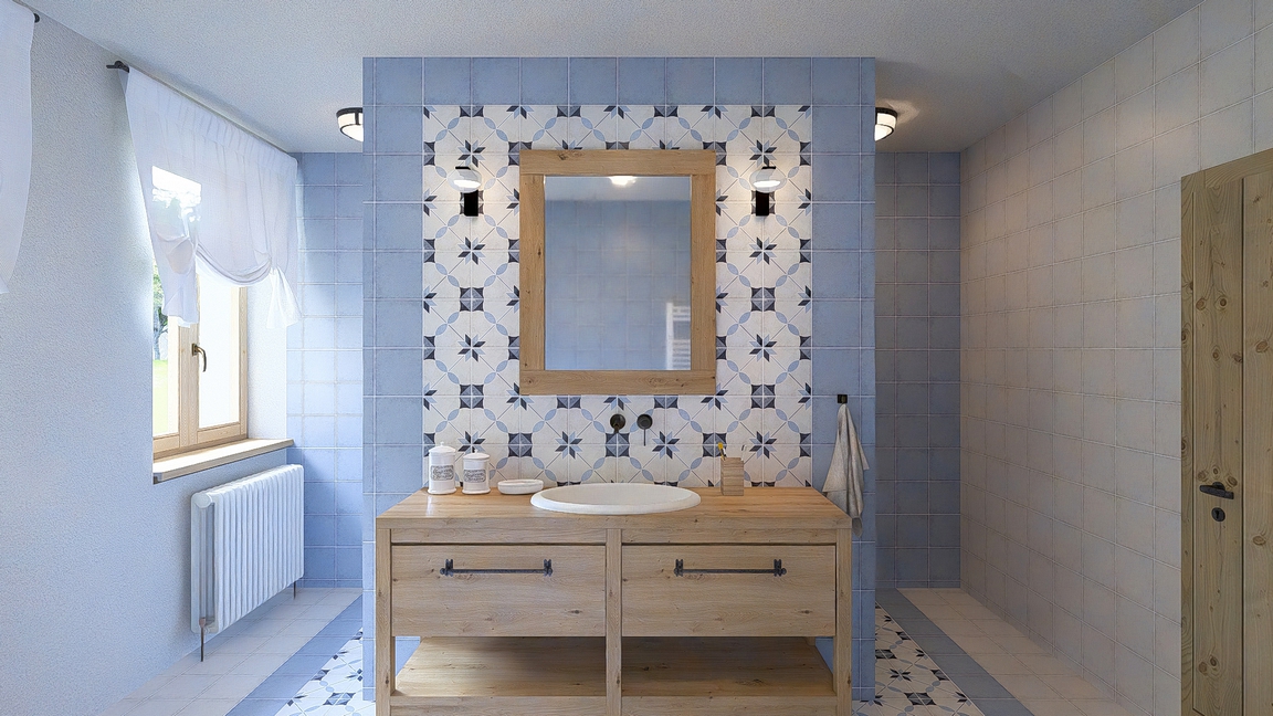 Návrh dvou koupelen v novostavbě velkorysého domu v moderním venkovském stylu.