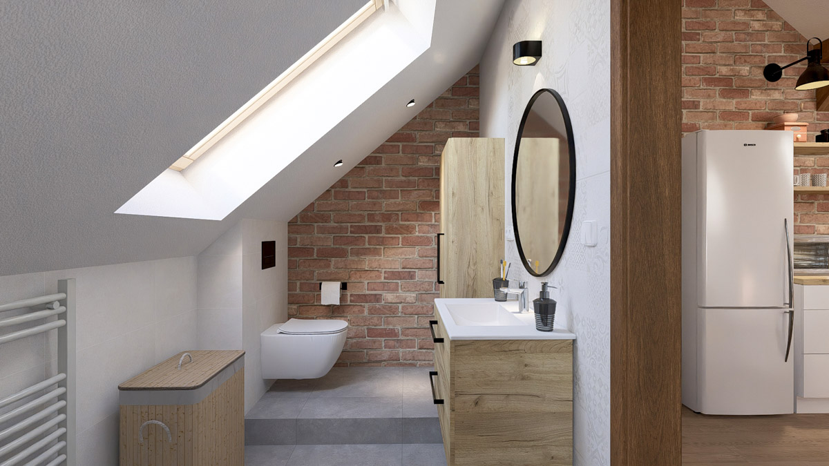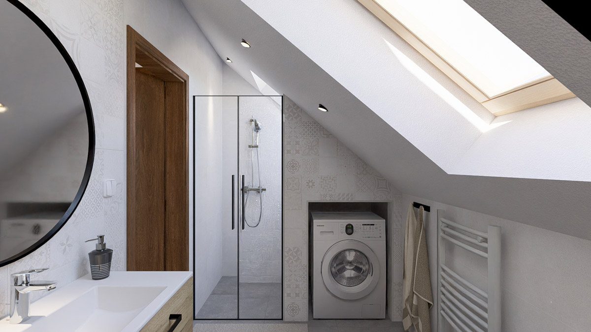 Koupelna je jednoduchá, světlá a maximálně praktická. I přes omezení daná šikmou střechou nabízí dostatek úložných ploch a plnohodnotné vybavení. Pračka je zapuštěna do niky pod šikminou, kde nepůsobí rušivě.