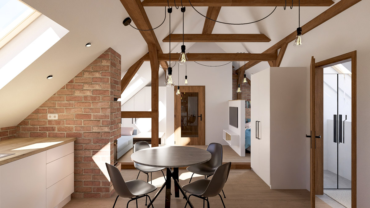 Přestavba půdy na garsonku o ploše 52 m² ve starší venkovské stavbě ukazuje, jak se dá s respektem k původní konstrukci vytvořit současné, funkční a hezké bydlení. V návrhu pracuji s přiznanými trámy, přistavovaným cihlovým zdivem, zavěšenými světly a jasně definovanými zónami v otevřeném prostoru.