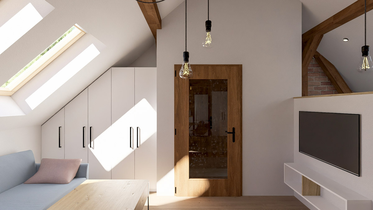 Tento návrh vznikl jako přestavba půdního prostoru o ploše přibližně 52 m² na komfortní garsonku pro dceru. Prostor se nachází ve starší tradiční venkovské stavbě s výraznou konstrukcí krovu. Cílem návrhu bylo vytvořit plnohodnotné bydlení pro mladou slečnu, které bude funkční a současné a zároveň bude respektovat původní stavbu a její charakter.