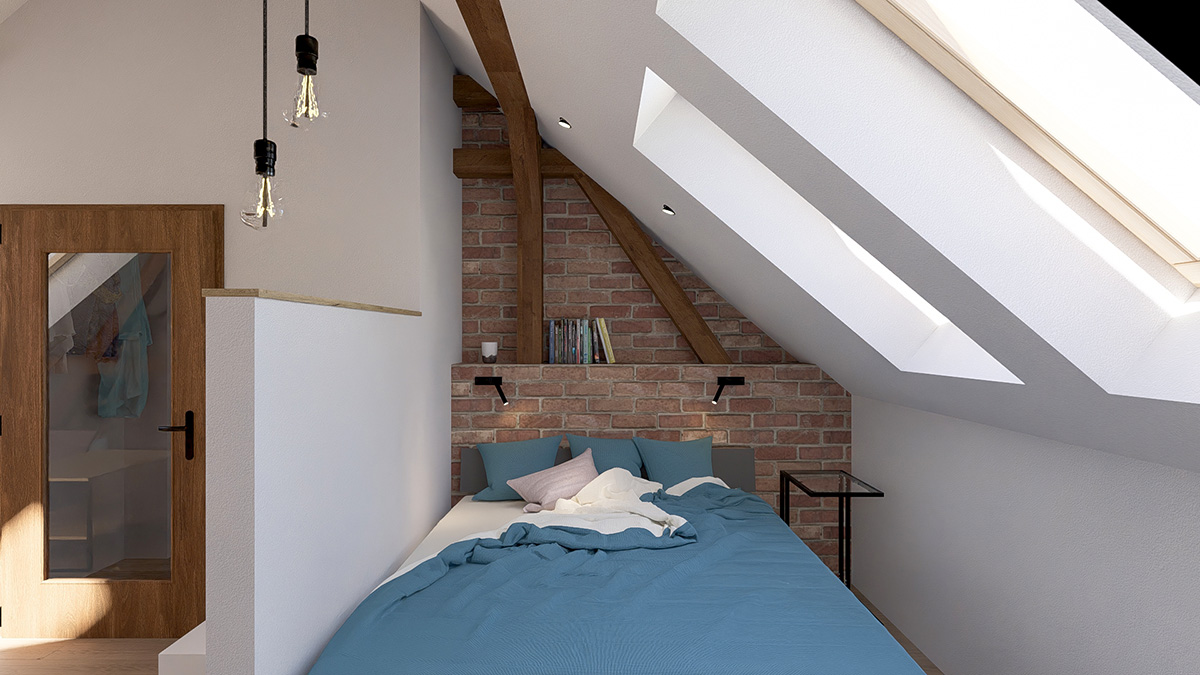 Spací část je situována do klidnější části půdy. Částečné oddělení nízkou stěnou vytváří pocit soukromí, aniž by prostor ztratil svou otevřenost.