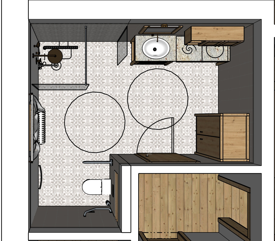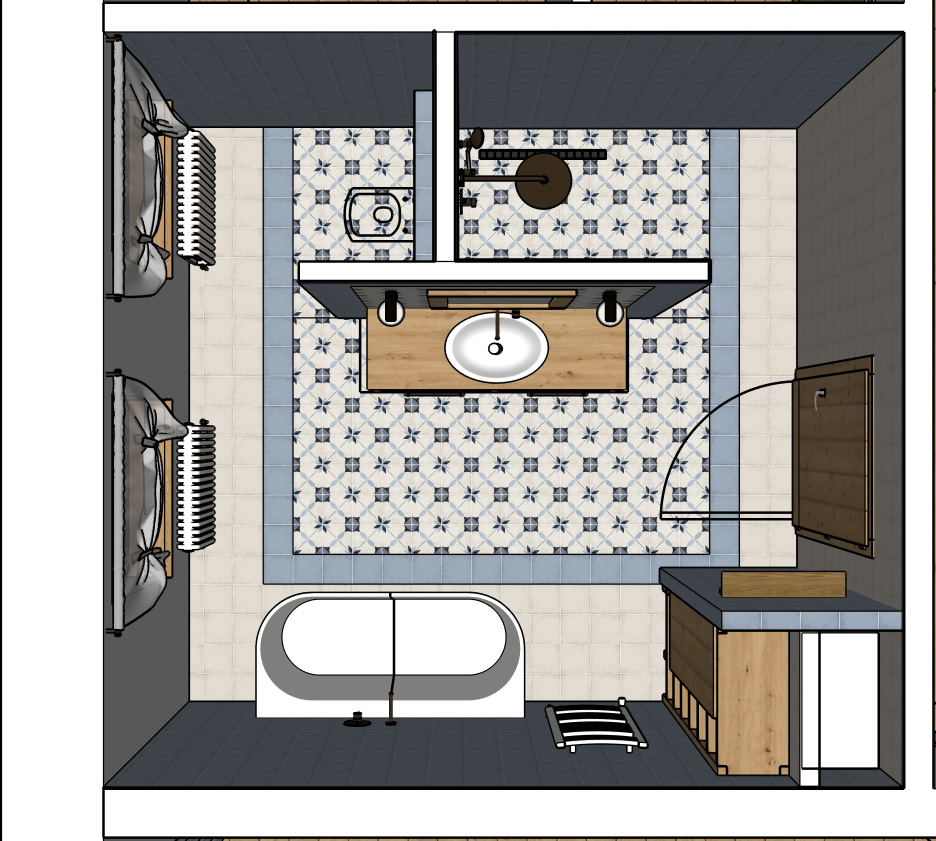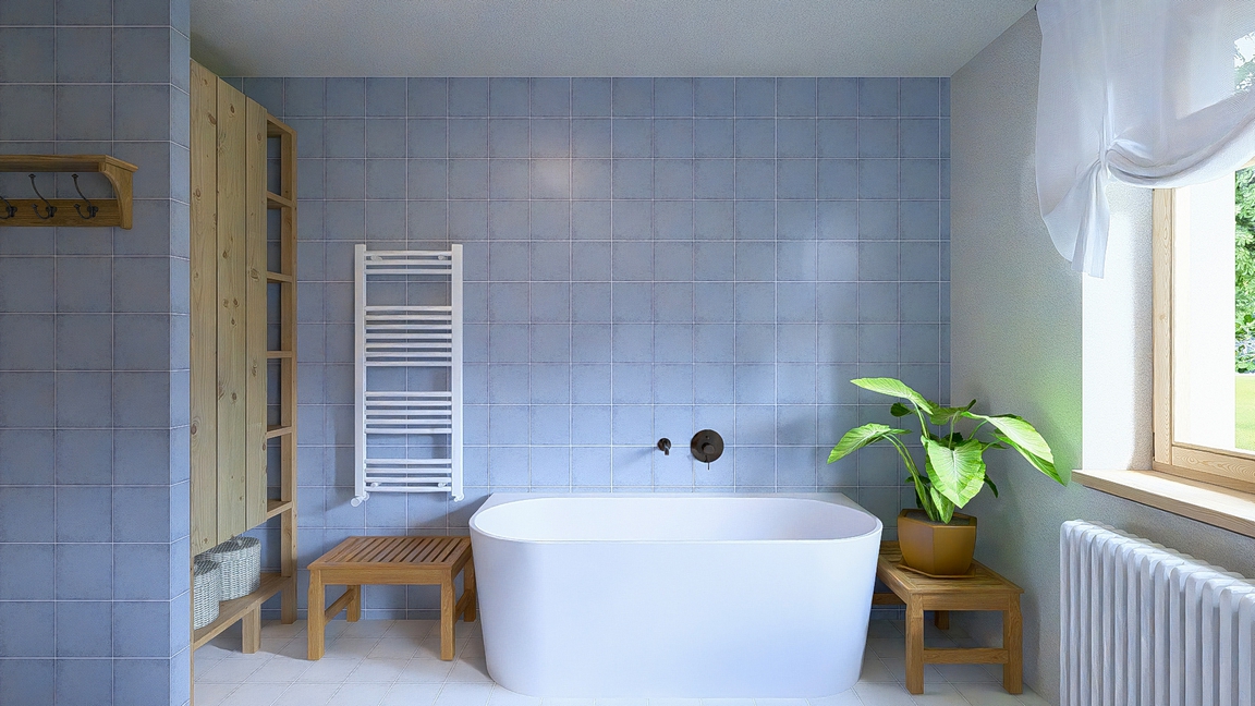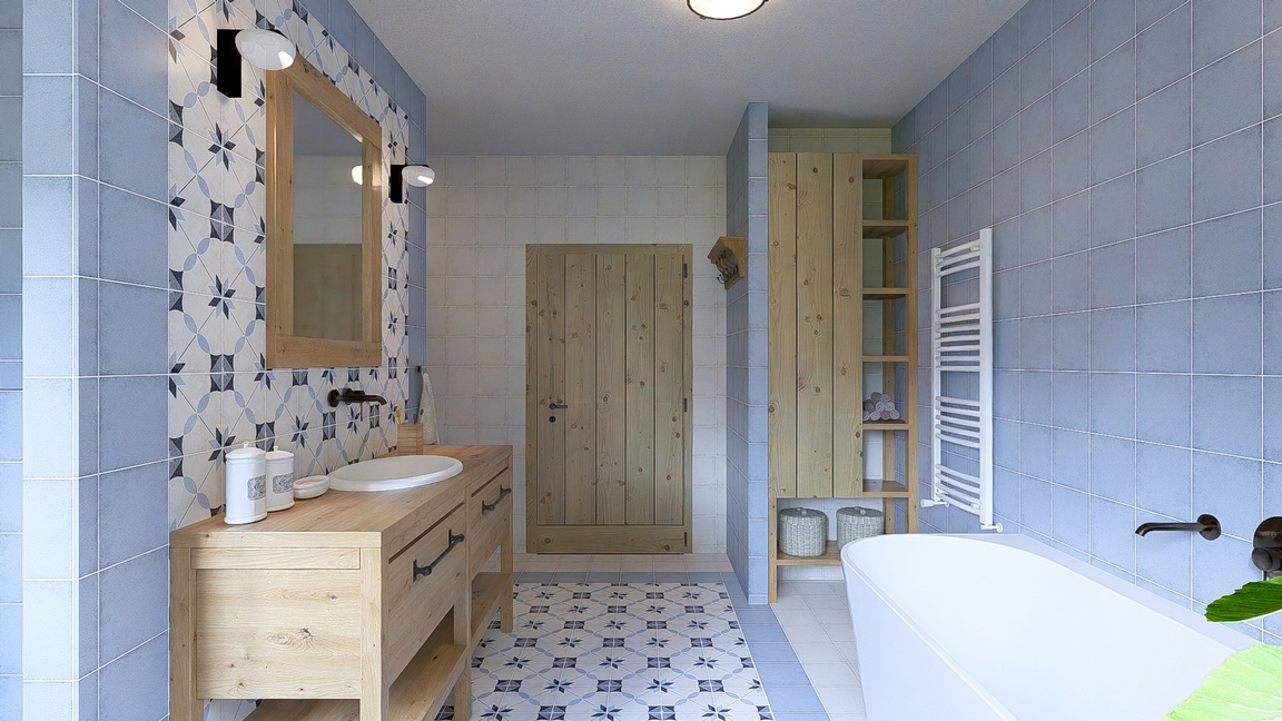 Návrh dvou koupelen v novostavbě velkorysého domu v moderním venkovském stylu.