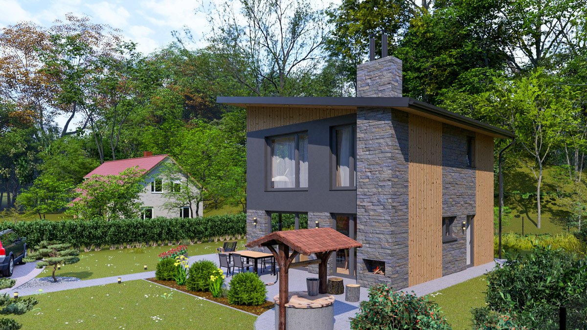Dominantním prvkem je venkovní krb obložený kamenem, který dodává stavbě charakter a propojuje dům se zahradou. Velká okna přinášejí lehkost, světlo a vizuální kontakt s okolím.