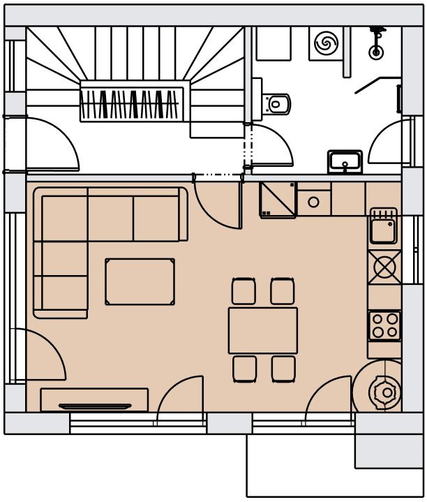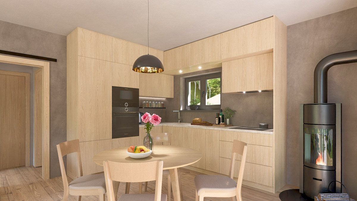 - kompaktní, ale plně funkční kuchyně s jídelním stolem a krbovými kamny