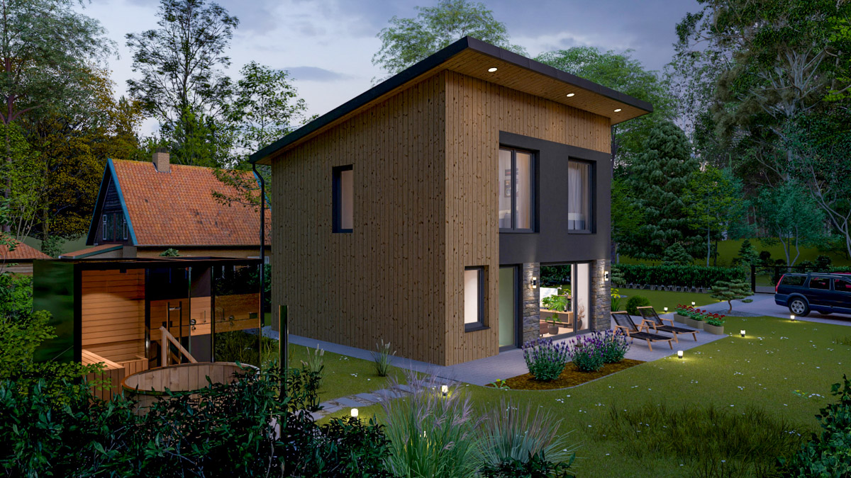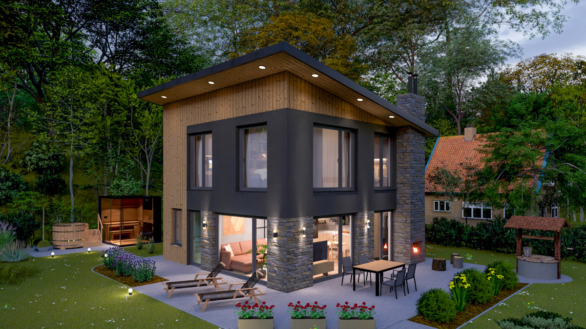 ¨Klient si přál navrhnout moderní dvoupodlažní dřevostavbu místo zahradní chaty o zastavěné ploše přibližně 59 m². Mým úkolem bylo vytvořit kompletní projekt — od nové dispozice interiéru přes fasádu až po řešení zahrady a wellness zázemí.