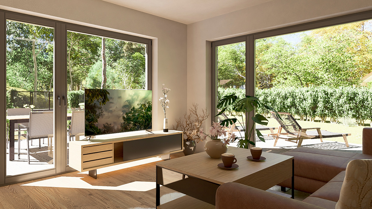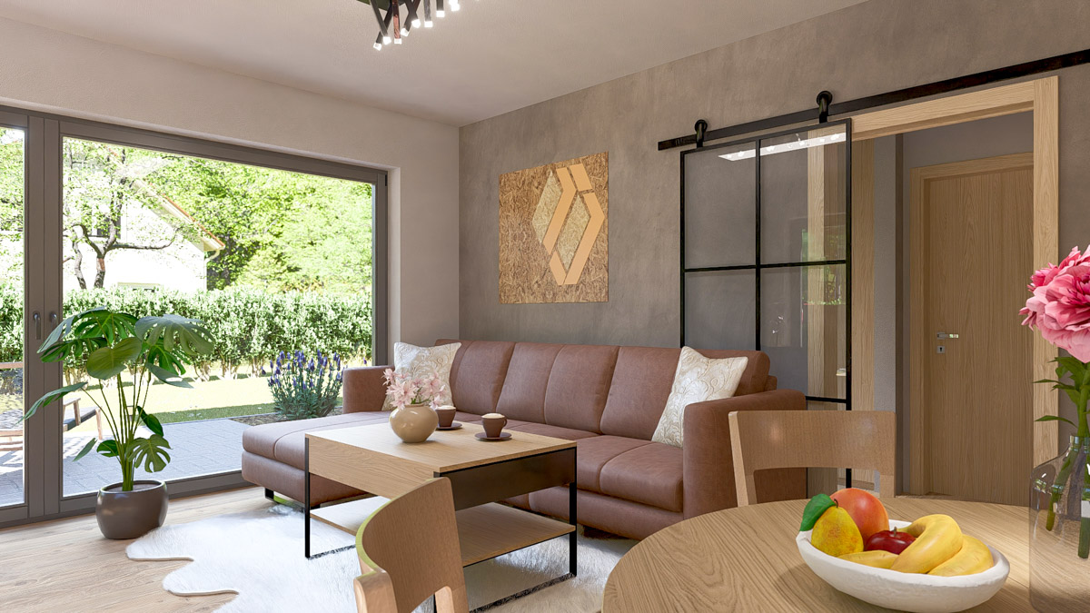 - obývací pokoj s výhledem do zahrady a východem na terasu s venkovním krbem