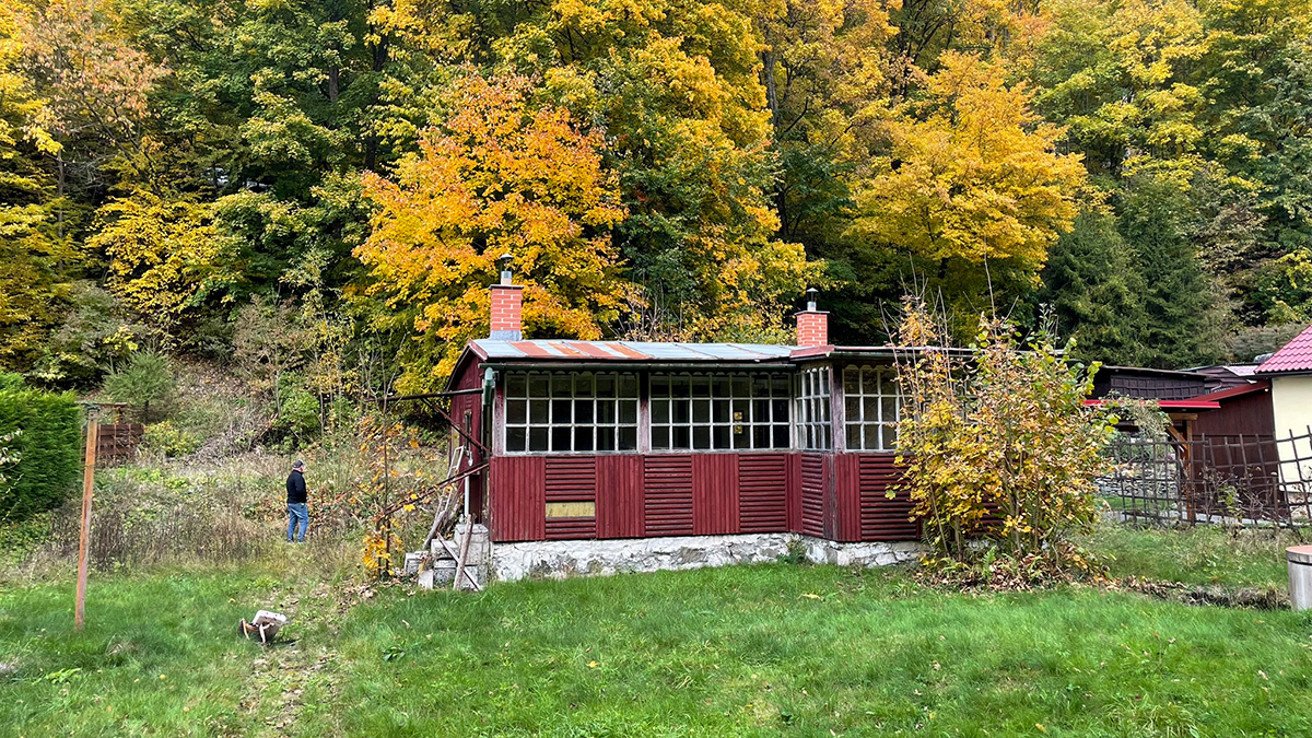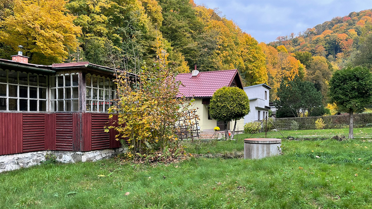 Dům z této strany ukazuje výrazné svislé dřevěné prvky a kompaktní hmotu objektu. V popředí je zachovaná studna jako připomínka původního charakteru pozemku.